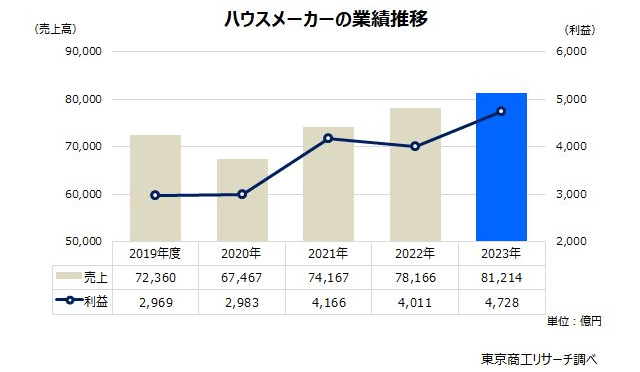 東京商工リサーチ(東京都千代田区)は11月20日、2023年度の売上高が100億円以上の「主要戸建メーカー、ハウスビルダー」115社の動向調査の結果を発表した。最新期(2023年度)の売上高合計は、前年度比3.8%増の8兆1214億円と3年連続上昇し、初の8兆円台となった。利益も17.8%増の4728億円と、売上高とともに過去5年間で最高水準を記録し、増収増益となった。