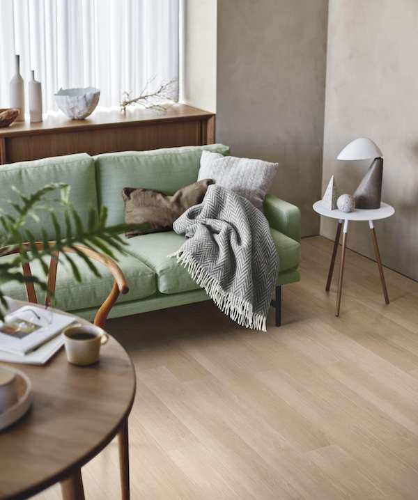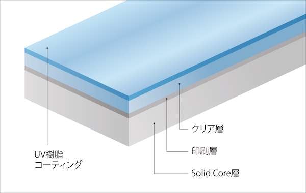 自然由来の炭酸カルシウムを主成分とする「Solid Core層」により、既存の床に重ね貼りして、適度な硬さでフラットに仕上がるリフォーム床材。