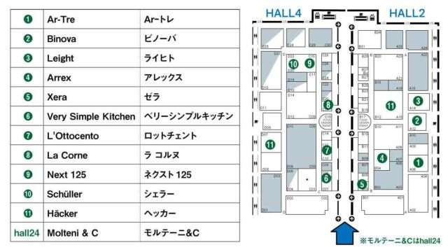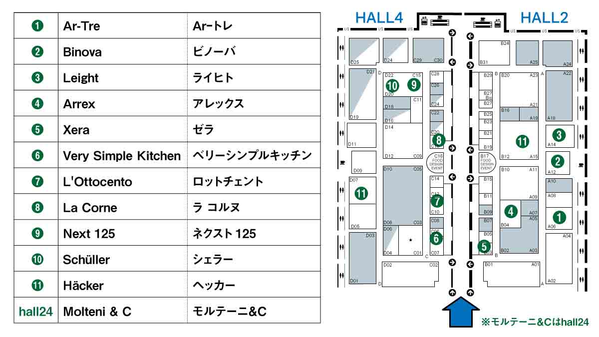 ①Ar-Tre -Ar-トレ- / ②Binova -ビノーバ- / ③Leight -ライヒト- / ④Arrex -アレックス- / ⑤Xera -ゼラ- / ⑥Very Simple Kitchen -ベリーシンプルキッチン- / ⑦L’Ottocento -ロットチェント- / ⑧La Cornue -ラ コルヌ- / ⑨Next 125 -ネクスト125- / ⑩Schüller -シェラー- / ⑪Häcker -ヘッカー- / ⑫Molteni & C -モルテーニ&C-