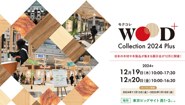 東京都、WOODコレクション実行委員会は、国産木材の展示商談会「WOODコレクション(モクコレ)2024 Plus」を12月19日、20日に東京ビッグサイト西1・2ホール(東京都江東区)にて開催する。オンライン会場は11月15日~2025年1月10日まで。