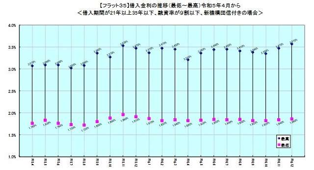 返済期間21年以上35年以下の最低金利は、融資率9割以下が1.86%、9割超が1.97%と、いずれも前月から0.02ポイント上がり、2カ月連続上昇した。最高金利は、9割以下が3.57%、9割超が3.68%で、前月から0.10ポイント上昇した。