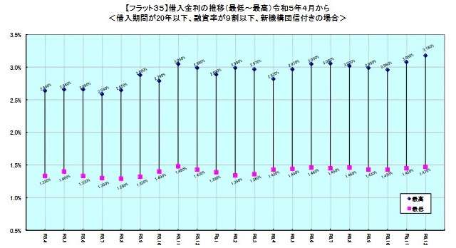 返済期間20年以下の「フラット20」の最低金利は、融資率9割以下が1.47%、9割超が1.58%で、前月から0.02ポイント上がり、2カ月連続上昇。最高金利は、9割以下が3.18%、9割超が3.29%と、いずれも0.10ポイント上昇した。
