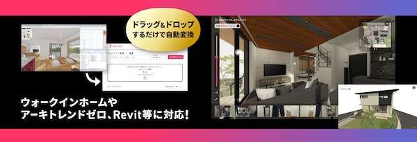 「Wail in home」「ARCHITREND ZERO」「Revit」といった住宅用3DCADから書き出した3DモデルのFbx形式ファイルをドラッグ&ドロップでクラウドに取り込み、自動で3Dウォークスルーデータに変換。