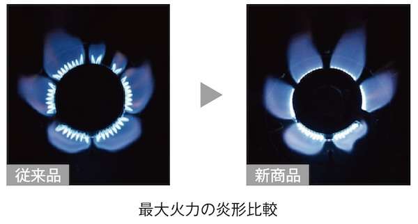 バーナー形状も変更。国内家庭用コンロとしては最大の火力を実現しながら、点火時の炎の出力を抑えて衣服への着火リスクを下げ、炎の加熱領域を広げたことで鍋をムラなく温めることができる。