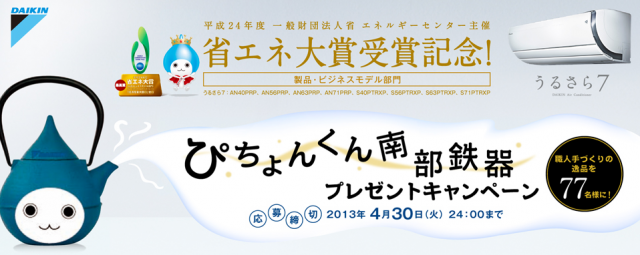 キャンペーンは、インターネット上でクイズに答えた正解者の中から抽選で77名にルームエアコンのマスコットキャラクター、ぴちょんくんの南部鉄器急須が当たるというもの。