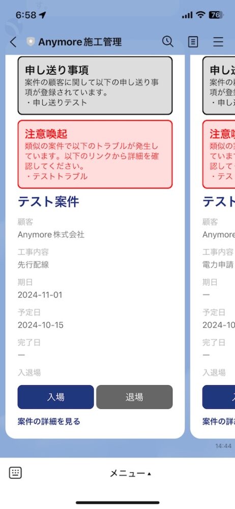 特徴は「LINE連携機能」。担当現場の情報がLINEで届き、LINEのメッセージから入退場の登録や写真の登録、報告作業を行うことができる。