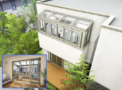 新商品は、雨水が入りにくい羽形状をした固定式ルーバー「エアールーバー」を正面開口部左右に二か所採用することで、風通しが良くなる、結露が生じにくい、内外気圧差の減少で漏水を防げるなど、洗濯物が乾きやすく、また、雨の心配があるときでも洗濯物を干したまま外出することができる。バルコニーが囲われているので、仕事帰りの夜から洗濯物を干しても防犯上も安全。働くママにターゲットを絞って開発したという新商品だ。