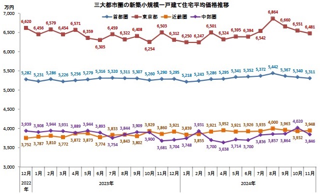 東京カンテイ(東京都品川区)は12月9日、主要都市における11月の新築一戸建て(土地面積50㎡以上100㎡未満)の供給動向を発表した。首都圏は3カ月連続下落、近畿圏は反転上昇、中部圏は反転下落した。