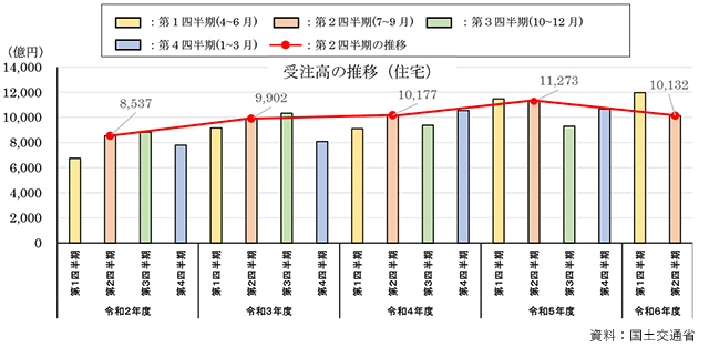 住宅工事の受注高を工事種類別に見ると、「増築工事」が147億円(前年同期比14.6%増)、「一部改築工事」が191億円(同61.4%減)、「改装・改修工事」が8474億円(同3.0%減)、「維持・修理工事」が1320億円(同31.1%減)となり、増築工事を除いて軒並み減少となった。