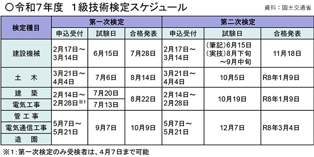 国土交通省は12月11日、2025年度の技術検定試験のスケジュール(PDF)を発表した。技術検定は6月1日から「管工事」などの試験を皮切りに開始。申込受付は検定種目ごとに順次行う。最終受付は「建築」「電気工事」が2月28日(※第一次検定のみの受検者は4月7日まで)、「建設機械」が3月14日、「土木」が4月4日、「管工事」「電気通信工事」「造園」が5月21日となっている。合格発表は25年11月~26年3月に行われる。