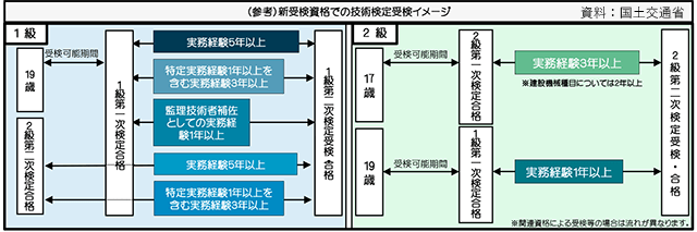 技術検定については制度の合理化を図るため、今年度より受検資格や検定問題の内容が一部見直されている。受検資格は1級の第一次検定は19歳以上、2級の第一次検定は従来通り17歳以上。1級・2級の第二次検定は第一次検定合格した後、一定期間の実務経験を経ることで受検可能となっている。2028年までは経過措置として旧受検資格での受験もできる。