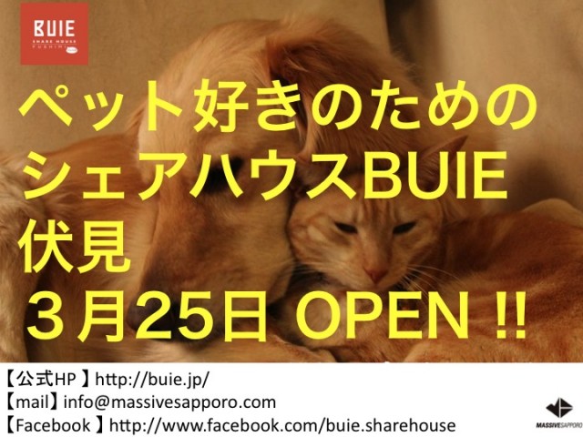 北海道札幌市を中心にシェアハウスや不動産、コワーキングスペースなどを運営するマッシブサッポロ(北海道札幌市)は、ペットと一緒に暮らせるシェアハウス「BUIE(部家)伏見」を3月25日、札幌市中央区にオープンする。
