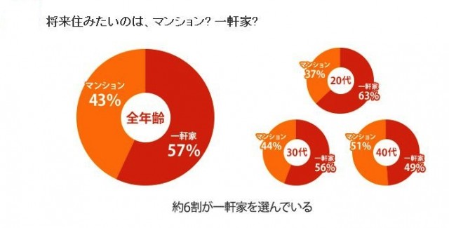 将来、マンションと 一軒家のどちらに住みたいかとの問いには57%が「一軒家」と回答。年代が若いほど一軒家志向が強く、20代で63%、30代で56%、40代で49%だった。理由の1位は「騒音など周りを気にする必要がない」で、「一軒家で育ったから」が続いた。一方、マンションを選んだ人の理由トップは「メンテナンスが簡単」、次が「防犯面がしっかりしている」だった。