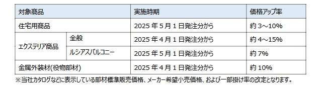 値上げ幅は、住宅用商品が約3~10%、エクステリア商品全般が約4~15%、ルシアスバルコニーが約7%、金属外装材が約10%。