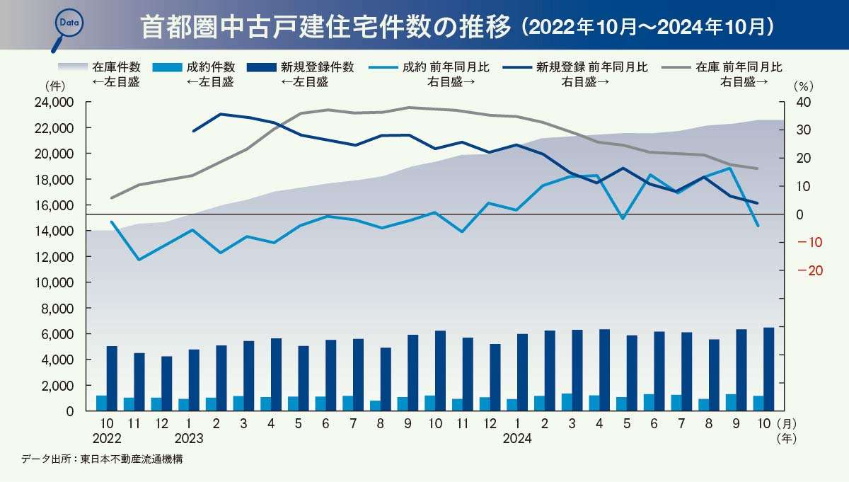 [図]はレインズによる首都圏の中古住宅の件数の推移。2024年は新規登録件数、成約数、在庫数とも対前年でほぼプラスになった。特に在庫数は右肩上がりで増えている。