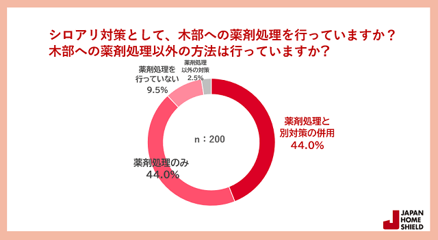 ジャパンホームシールド(東京都墨田区)はこのほど、全国の住宅・建設事業者200人を対象に実施した「シロアリ対策(防蟻処理)に関する調査2024」の結果を発表した。シロアリ対策として木部への薬剤処理を「行っている」のは88%に達し、そのうち半数が別対策を併用していた。主流の薬剤処理に別対策を組み合わせることで、安全性を高めているとみられる。なお、併用で行っている対策の約半数が「土壌処理」だった。