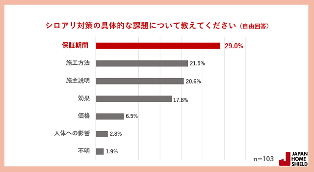 「課題点や改善したい点(自由回答)」を聞いたところ、最も多かったのは「保証期間」(29.0%)で、「施工方法」(21.5%)が続く。事業者からは、「長期保証にしたい」「更新に手間がかかる」「対策の効果や持続性が不安」といった声が多く寄せられた。