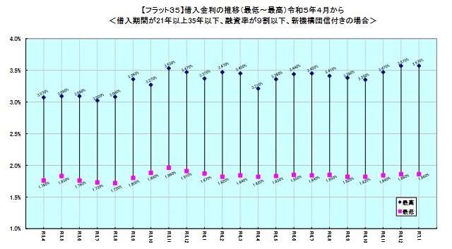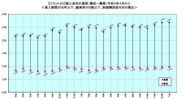 返済期間20年以下の「フラット20」の最低金利は、融資率9割以下が1.47%、9割超が1.58%で、いずれも前月と変わらず横ばい。最高金利は、9割以下が3.18%、9割超が3.29%だった。