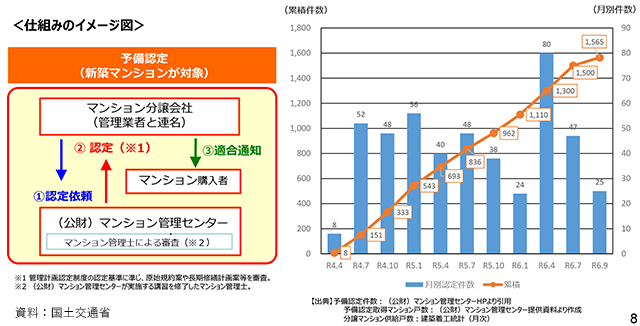 そこでマンションの管理適正化を促すため、管理計画認定制度の拡充などを要望。同制度は、新築時から適切な長期修繕計画や修繕積立金の額を設定するもので、すでに新築マンションの約半数で予備認定が取得されている。今後は区分所有者に修繕計画などへの理解を求めるだけでなく、分譲事業者に対しても適正な管理計画作成への誘導を行い、それを管理組合に引き継ぐ仕組みを導入するべきだとした。