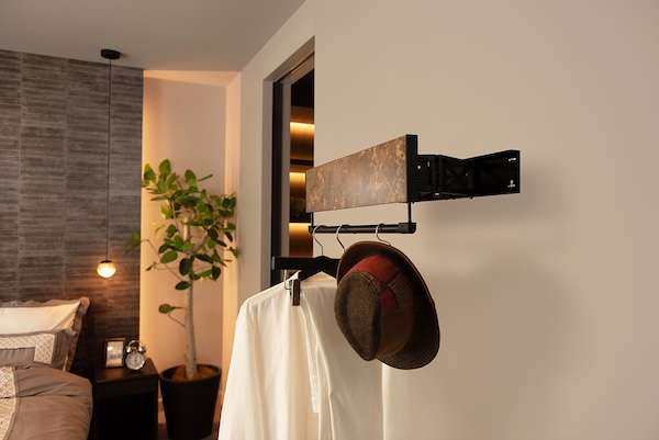 使用しないときはインテリアアートとして、パネルの内側から竿を出して物掛けとして、壁から離して衣類掛けとして、3種類の使い方ができる。