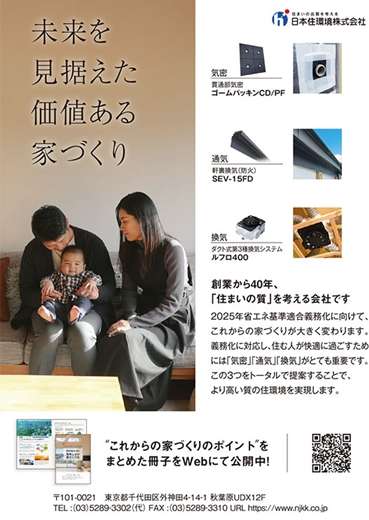 日本住環境(東京都千代田区)は、省エネ基準適合義務化に対応する住まいづくりには「気密」「通気」「換気」が重要だとして、この3つをトータルで提案することで、義務化に対応するより高い質の住まいづくりを推進している。