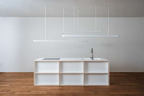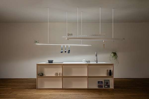 ステンレスの1枚板を折紙のように切る、折る、曲げるという工程だけで成形し、キッチン空間に浮かせるユニークなインテリア収納。