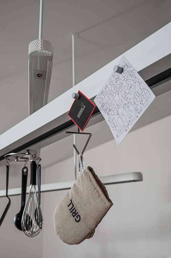 調理器具やミトン、植物を吊るしたり、調味料を置いたり、メモやレシピを貼ったりと自由な使い方ができる。