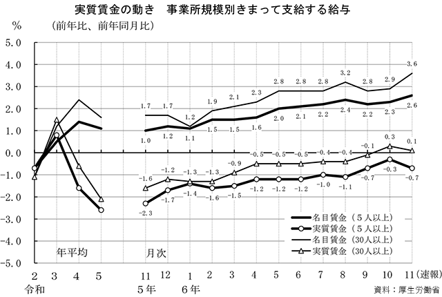全産業平均は、現金給与総額が30万5832円(同3.0%増)。このうち一般労働者は39万2121円(同3.0%増)だった。名目賃金は上昇傾向にあるが、物価の上昇により実質賃金は同0.3%のマイナスとなり、4カ月連続で低下した。