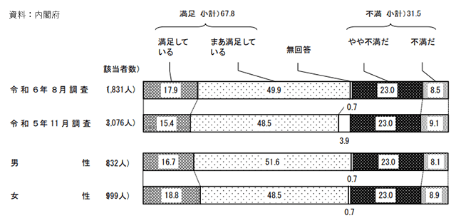 内閣府がこのほど公表した「国民生活に関する世論調査」(2024年8月調査)結果によると、現在の住生活について「満足している」「まあ満足している」と答えた人は67.8%で、前回調査(2023年11月)と比べて3.8ポイント上昇した。男女差はほとんどなかった。