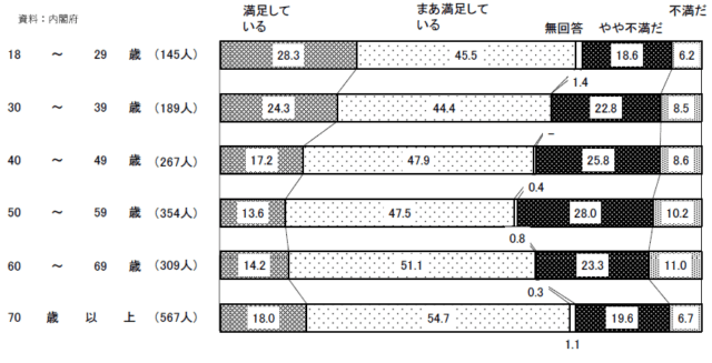 年齢別では、満足している人の割合が最も高かったのは「18~29歳」で、全体の73.8%が「満足している」「まあ満足している」と回答。以降、年齢が増すほど満足している人の割合が減り、「30~39歳」は68.7%、「40~49歳」では65.1%となった。最も低かったのは「50~59歳」の61.1%だった。