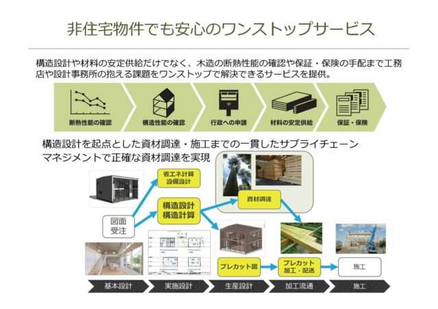弊社では、構造設計事務所としての機能に加え、材料の調達やプレカット、現場まで一気通貫で支援ができる。「サプライチェーンを持った構造設計事務所」と考えていただければわかりやすいと思う。サプライチェーンを持っていることで、例えば各地で地域材利用に対する補助が行われているが、構造設計の段階で必要な断面の見当がつくので、材もスムーズに調達できる。