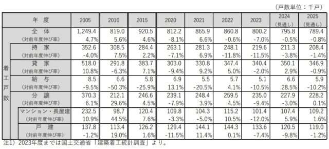 24年4~10月にかけ、毎月の着工数が過去10年で最低となった持ち家は21.1万戸(同3.8%減)と減少を見通す。分譲住宅は、マンションが増加する一方で戸建てが減少し、全体では22.8万戸(同3.0%減)と予測した。