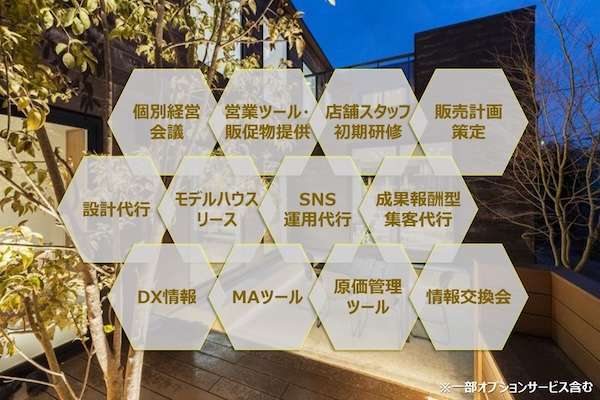 具体的には、モデルハウスの建築費用を本部が一時的に負担して月額リース契約とすることでイニシャルコストを抑えた集客が可能な「モデルハウスリース」、同社・相馬哲也社長が工務店視点で開発した原価管理システム「すごいよ山下くん」、工務店に代わって広告運用を代行し送客件数に応じて費用が発生する「購入型 集客代行サービス」などを通じて経営を支援する。