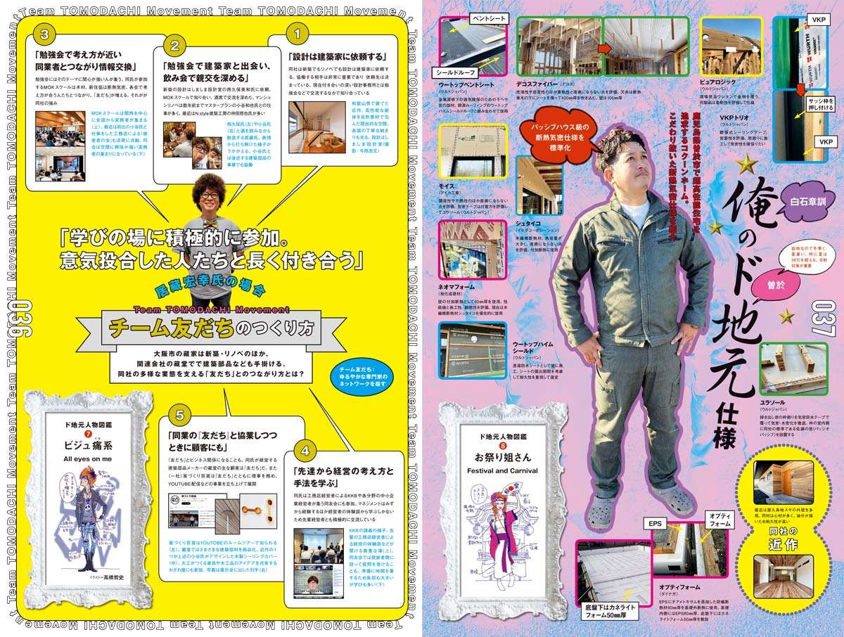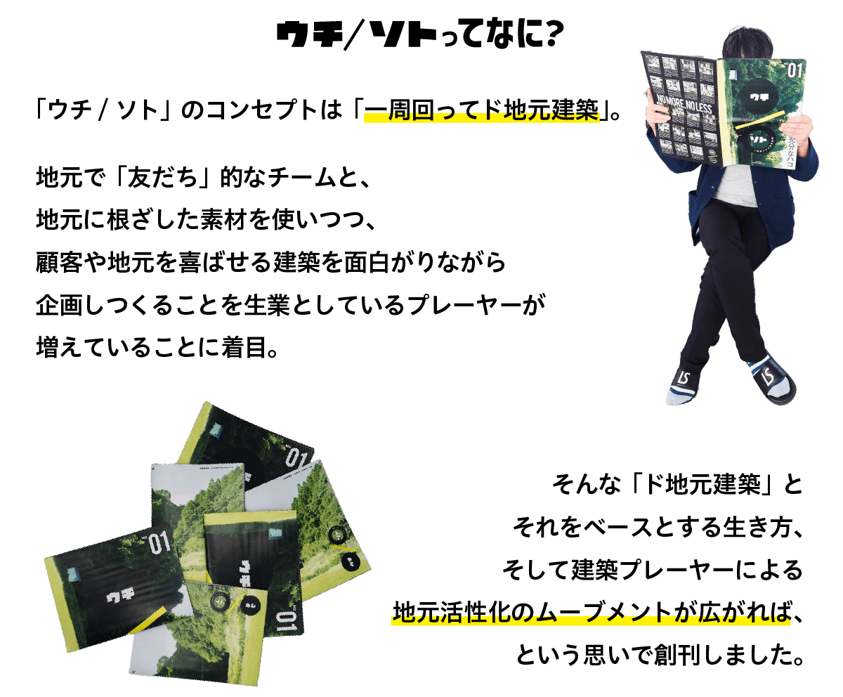 「ウチ/ソト」のコンセプトは「一周回ってド地元建築」。地元で「友だち」的なチームと、地元に根ざした素材を使いつつ、顧客や地元を喜ばせる建築を面白がりながら企画しつくることを生業としているプレーヤーが増えていることに着目。そんな「ド地元建築」とそれをベースとする生き方、そして建築プレーヤーによる地元活性化のムーブメントが広がれば、という思いで創刊しました。