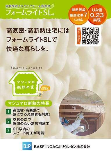 BASF INOACポリウレタン(愛知県新城市)は、現場発泡ウレタンフォーム断熱材「フォームライトSL」を使用することで、高気密・高断熱住宅を実現する「マシュマロ断熱の家」を提案する。断熱等級7に対応し、UA値0.23という高い断熱性能を持つ。