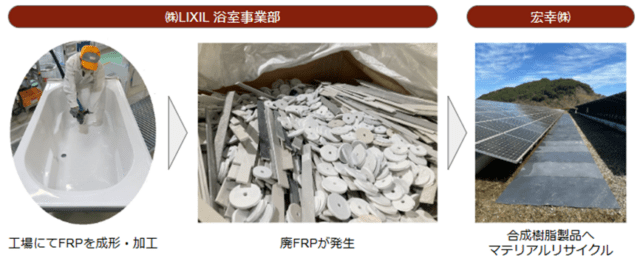今回、再資源化事業計画認定企業である宏幸と協業することで、同社筑波工場から排出されるすべての廃FRPを、新たな製品の原料として再利用するマテリアルリサイクルできるようになる。浴室工場全体のFRP廃棄量の約半分の再資源化が可能となり、資源の循環利用を加速。浴室工場全体の廃棄物の再資源化率は86.2%となる。