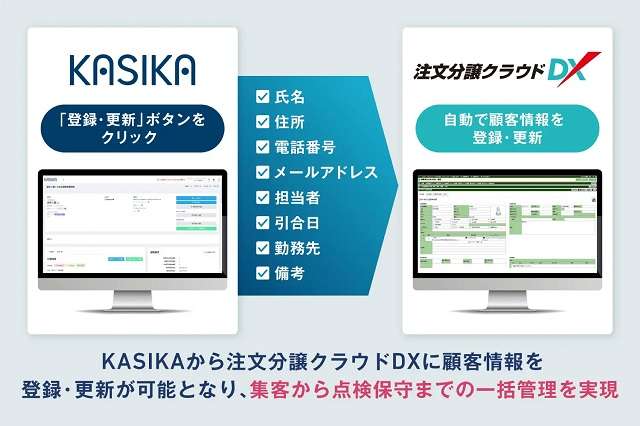 これにより、Cocoliveの自動追客・商談管理ツール「KASIKA」の顧客情報を、ダイテックの基幹システム「注文分譲クラウドDX」へボタン1つで自動登録・更新できる機能を実現。顧客情報の連携により、「KASIKA」画面から「注文分譲クラウドDX」にも簡単にアクセス可能となる。
