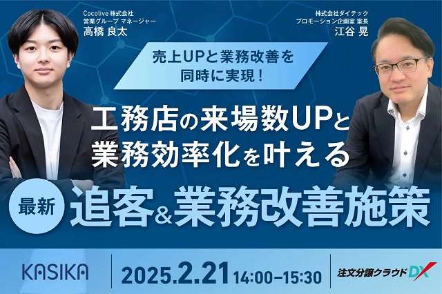 今回のサービス連携を記念し、2月21日にオンラインセミナー「工務店の来場数アップと業務効率化を叶える最新追客術&業務改善施策」を開催。工務店の最新事例に基づいた掘り起こし施策と業務改善施策を公開する。詳細、申し込みはこちらから。