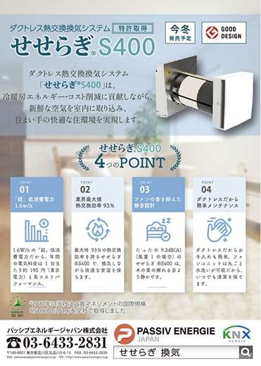 パッシブエネルギージャパン(東京都品川区)は、業界最大値・熱交換率93%のダクトレス熱交換換気システム「せせらぎ」の新バージョン「せせらぎS400」を今冬発売する。給排気が60秒ごとに切り替わる効率的な換気設計で、快適な住環境を実現する。