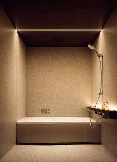 具体的には、浴槽に沿うように首の付け根から足の先まで無理なくゆったり浸かれる形状の浴槽とマイクロバブルで湯冷めしにくい状態を保てるようにした。主照明は、湯船に浸かりながらそのままの体勢で、ボタン一つで調色が可能。天井照明を消して演出照明のみを点灯させることもでき、光でリラックスした気分づくりをサポートする。光を吸収し、視覚的な刺激を抑えるブラック色の天井も特長となっている。