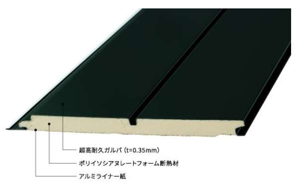 角波成形鋼板と断熱材を一体化する独自技術により平滑な意匠を実現するとともに、施工時のベコつきや歪みを解消している。