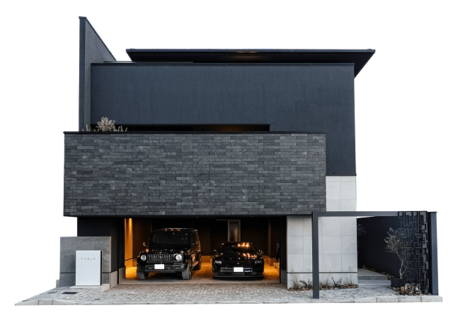 限られた敷地を最大限に活用した都市型邸宅で、大型輸入車2台を格納する大開口のインナーガレージや、吹き抜けと意匠性の高い照明・階段を採用した上質なリビング空間を実現。建物・基礎・地盤を一体化した高精度な耐震設計(PT工法)と温熱計算に基づいた全館空調システムで、安心と快適を両立している。また、ホームエレベーターやグラスルーチェ、ソーラーパネル+テスラ蓄電池を搭載し、照明や空調、セキュリティをスマホで一括管理できるスマートホーム設計も特長となっている。