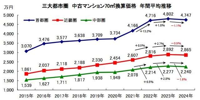東京カンテイ(東京都品川区)は1月23日、2024年の1年間の三大都市圏・主要都市における中古マンション70㎡あたりの平均価格を発表した。