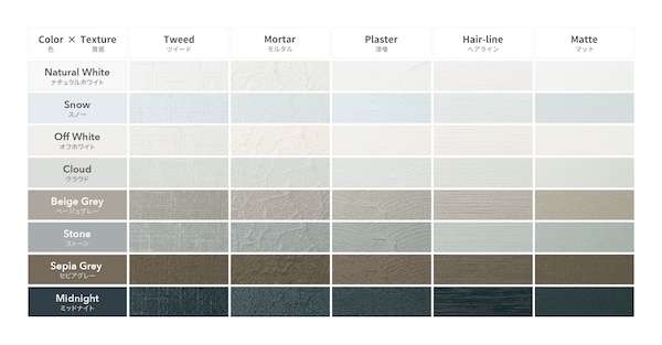 (3)「BLEND」は「risora」のみ対応。モノトーン基調の8色×壁紙で用いられる定番の質感5柄による計40種のデザインから選べる。