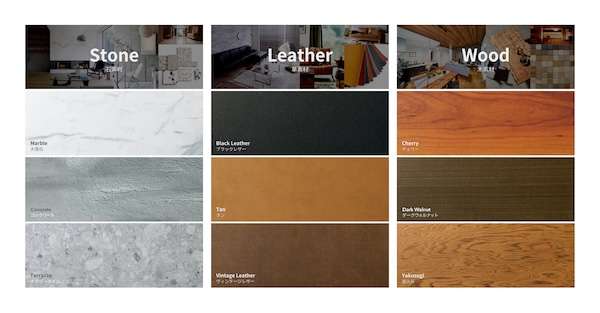 (2)「NATURE」は、石・革・木の素材感を微細な凹凸まで表現している。