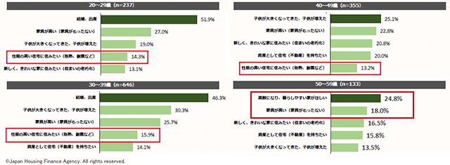 住宅を取得した理由について詳しくみると、回答者の5割を占める30代は「結婚・出産」(46.3%)、「子供が大きくなってきた、子供が増えた」(30.3%)、「家賃が高い(家賃がもったいない)」(25.7%)が上位に。また、自宅の老朽化が気になり始める40代では、「新しく、きれいな家に住みたい」との回答が20.8%を占めた。