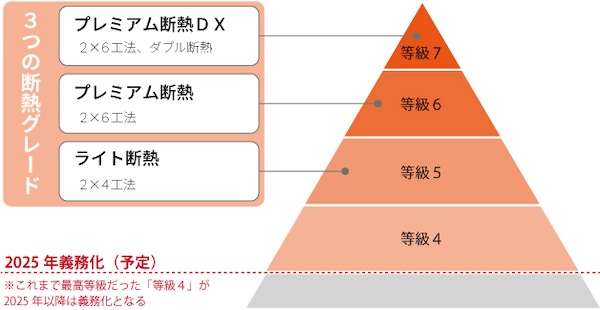 断熱等級7対応・UA値0.24の「プレミアム断熱DX」、断熱等級6対応・UA値0.39の「プレミアム断熱」、断熱等級5対応の「ライト断熱」の3種類の断熱グレードをラインアップ。これら3つのグレードから、こだわりや予算に応じて断熱性能を選ぶことができるようにした。