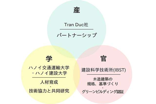 また、ベトナム現地で産官学連携体制を構築する。ベトナム建設省傘下の建設科学技術所と木造建築の規格・基準づくりで共同研究・協力するほか、ハノイ交通運輸大学などと社員大工の育成・職業訓練事業、技術協力と共同研究を行っていく。Tran Duc社も含めた連携体制によって、ベトナムでの木造建築普及を加速させるとしている。12月にはTran Duc社が来日し、日本の木造建築・技術を視察した。