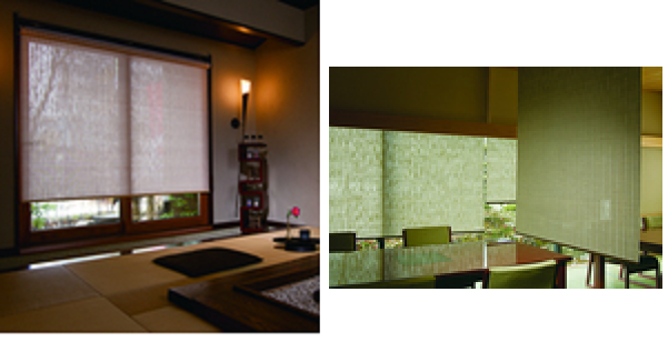 新商品は、竹経木に和紙のような風合いの不織布を織り込んだもので、視線や陽射しを程よく遮るので、和室の窓まわりはもちろん宿泊施設や店舗などの間仕切りにも適す。