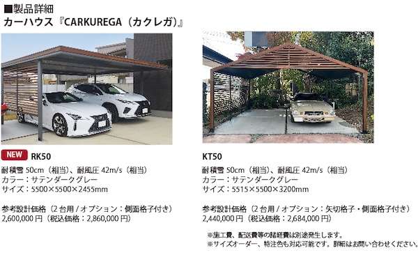 カツデン(東京都台東区)は、スチールと天然木を組み合わせた駐車場「CARKUREGA(カクレガ)」にフラット屋根タイプの「RK50」をラインアップした。